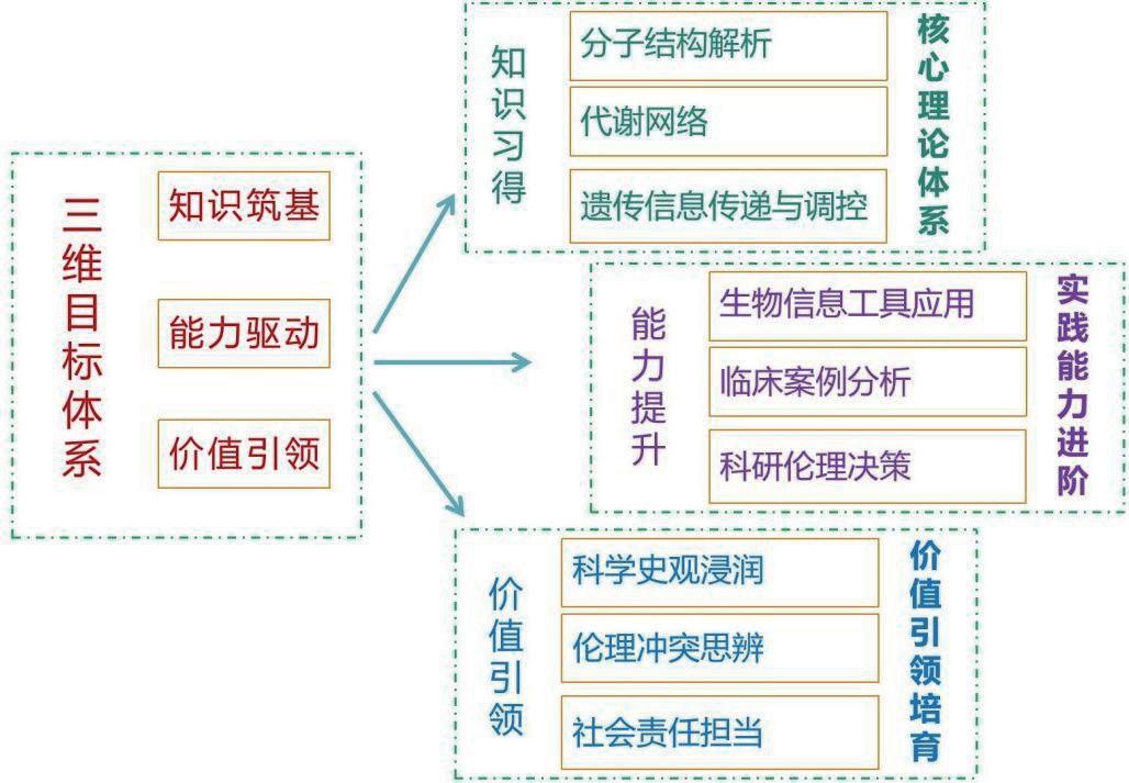 以“立德树人”为根本目标,遵循“价值引领、能力驱动、知识筑基”的协同逻辑,重构知识、能力、素养三维目标体系,三维目标体系的协同架构:知识筑基:聚焦生物化学核心理论体系构建,涵盖分子结构解析、代谢网络调控、遗传信息传递等基础理论,夯实科学认知根基;能力驱动:强化复杂问题解决能力培养,注重生物信息工具应用、临床案例推理、科研伦理决策等实践能力进阶;价值引领:锚定医学人文精神塑造,通过科学史观浸润、伦理冲突思辨、社会责任唤醒等路径,实现专业教育与价值观培育的同频共振。三维目标以“知识习得—能力转化—素养内化”为进阶脉络,形成“理论奠基实践、实践反哺价值”的育人闭环(如图2)。