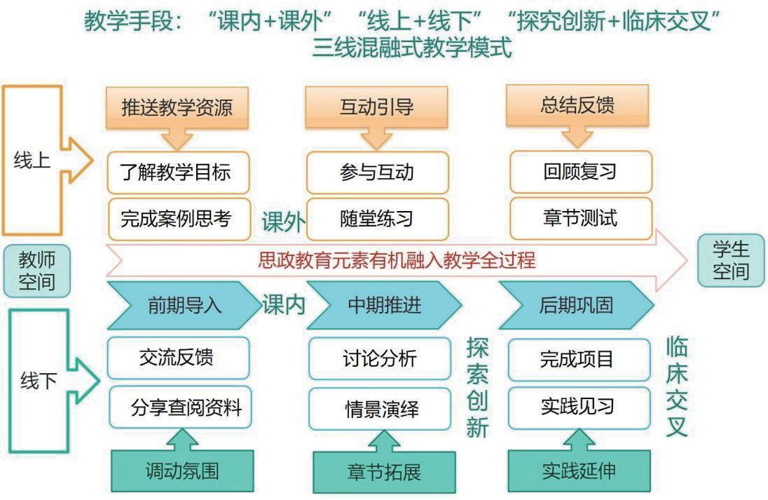 2.教学手段创新:采用“课内 + 课外”“线上 + 线下”“探究创新 + 临床交叉”三线混融式教学模式(如图7)