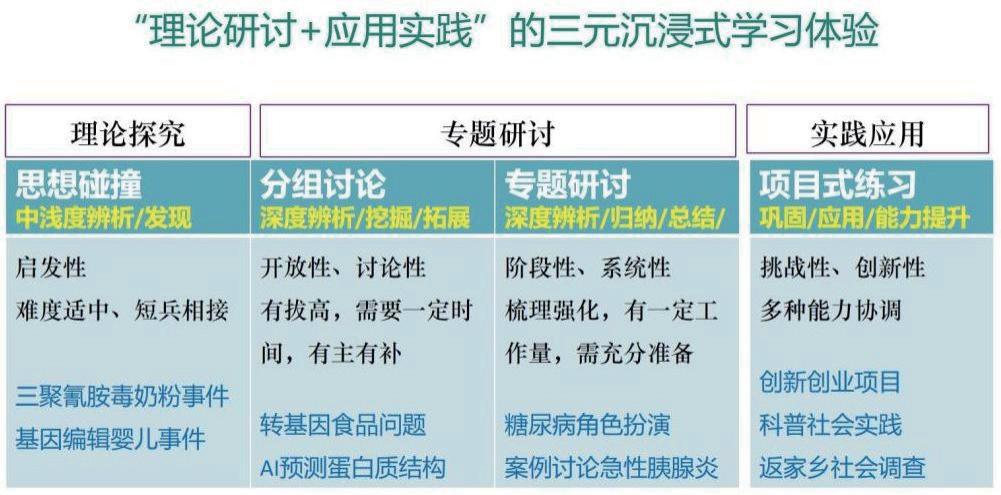 理论研讨板块:注重中浅度的辨析与发现,通过设置难度适中、节奏紧凑如“短兵相接”般的议题,激发学生即时思考。分组讨论环节:强调对知识进行深度辨析、挖掘与拓展。以开放性和讨论性为特点,议题往往具有一定拔高性,需要学生投入较多时间深入探究。在小组协作中,成员有主有补,相互启发。例如转基因食品问题、AI预测蛋白质结构等前沿且复杂的主题,学生在交流中打破思维局限,挖掘问题本质,拓展知识深度与广度。专题研讨板块:聚焦深度的辨析、归纳与总结,具有阶段性和系统性特征。要求学生对特定专题进行梳理强化,通常工作量较大,需要在前期做充分准备。以糖尿病角色扮演、急性胰腺炎案例讨论为例,学生在模拟场景和案例分析中,系统整合知识,深化对专业内容的理解与运用。实践应用板块:以项目式练习为核心,着重巩固知识、促进应用以及提升综合能力。所设置的项目具有挑战性和创新性,要求学生协调多种能力。涵盖创新创业项目,鼓励学生将专业知识转化为创新实践;科普社会实践,促使学生运用知识服务社会、传播科学;返家乡社会调查,引导学生关注社会实际,提升调研分析等综合素养,全方位培养学生解决实际问题的能力(如图9-12)。