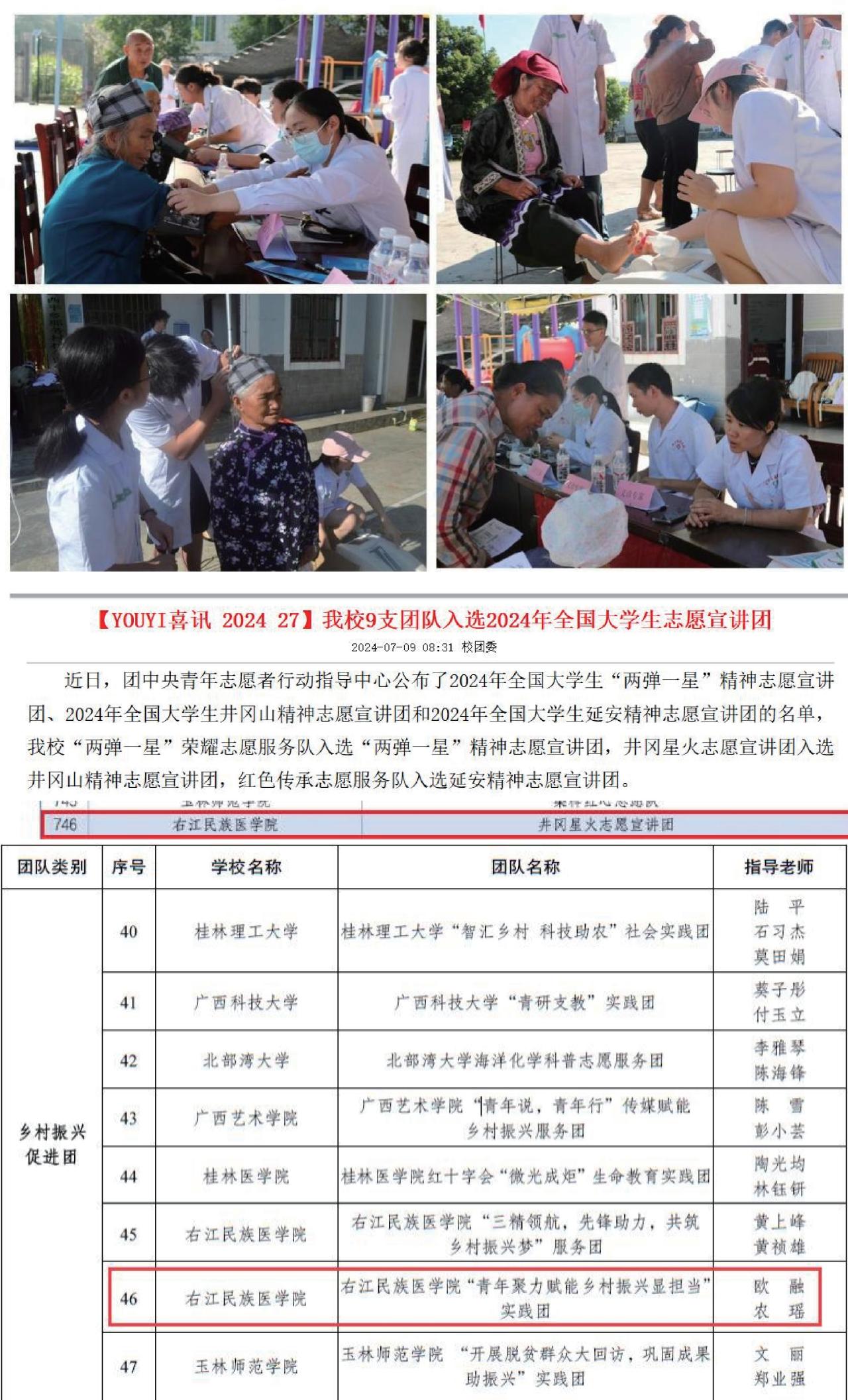 通过课程思政与学科知识的有机相容,学生社会责任感、强国使命感不断内化于心、外化于行,积极投身社会实践。学生们积极参与乡村振兴社会实践活动,深入基层为群众提供医疗服务,助力乡村医疗发展;踊跃开展社区科普活动,将医学知识传递给大众,提升居民健康素养。多支学生团队凭借出色的表现,成功入选 2024 年全国大学生“两弹一星”精神、井冈山精神、延安精神等志愿宣讲团,体现了课程思政在传承红色基因、弘扬爱国精神教育上的卓越成效。此外,学生们在人文素养提升方面也表现突出,在经典诵读竞赛中荣获佳绩,展现出深厚的人文底蕴与精神风貌(如图18)。