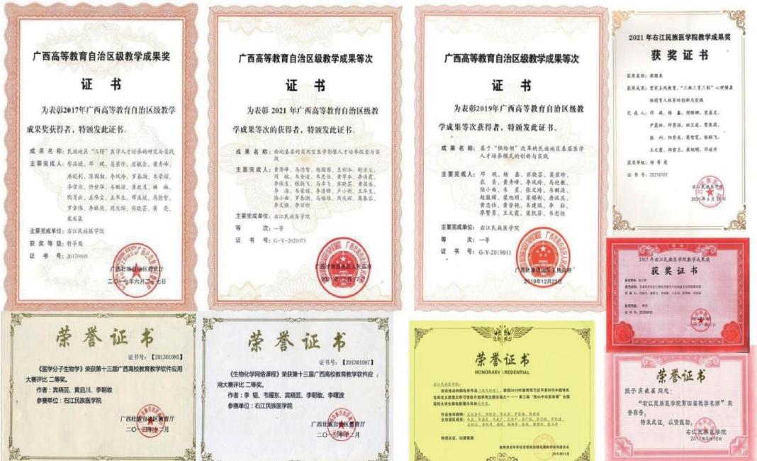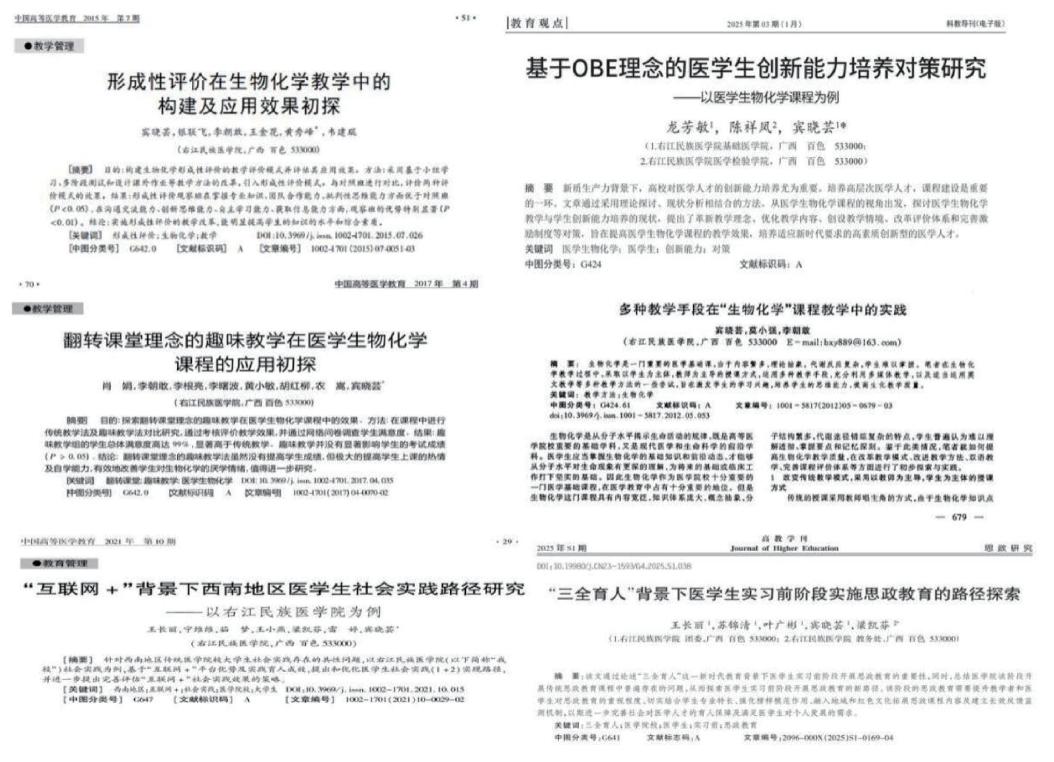 教学团队通过课程建设不断更新教学理念,不断创新教学方法、优化教学设计、积极探索教育教学改革、积淀专业素养,逐步造就“有理想信念、有道德情操、有扎实知识、有仁爱之心”的高素质师资队伍。团队荣获自治区级教学成果奖3项、5 项校级教学成果奖,省级教学竞赛奖2 项,校级教学竞赛奖3项;主持3项自治区级教改重点项目,5项一般 A 类项目、6项一般B类项目以及6项校级项目,这些项目聚焦于教育教学中的关键问题,涵盖了从课程体系优化到教学手段创新等多个维度,通过深入研究与实践探索,为全区的教育改革提供可借鉴的模式与经验。科研领域的丰硕成果积极反哺教学。团队主持3项国家自然科学基金项目、6项广西自然科学基金项目以及12项市厅级科研课题,团队教师带领课程学生围绕这些科研课题积极开展科学探索,真正将学科知识的学习、应用于探索紧密结合,并将研究成果整理发表相关文章,这些论文涉及教学改革、科研发现、实践育人等领域共67篇,其中19篇为 SCI收录文章、12篇中文核心论文,出版专著7篇为学界、教育届提供了富有价值的思考与借鉴(如图19-21)。